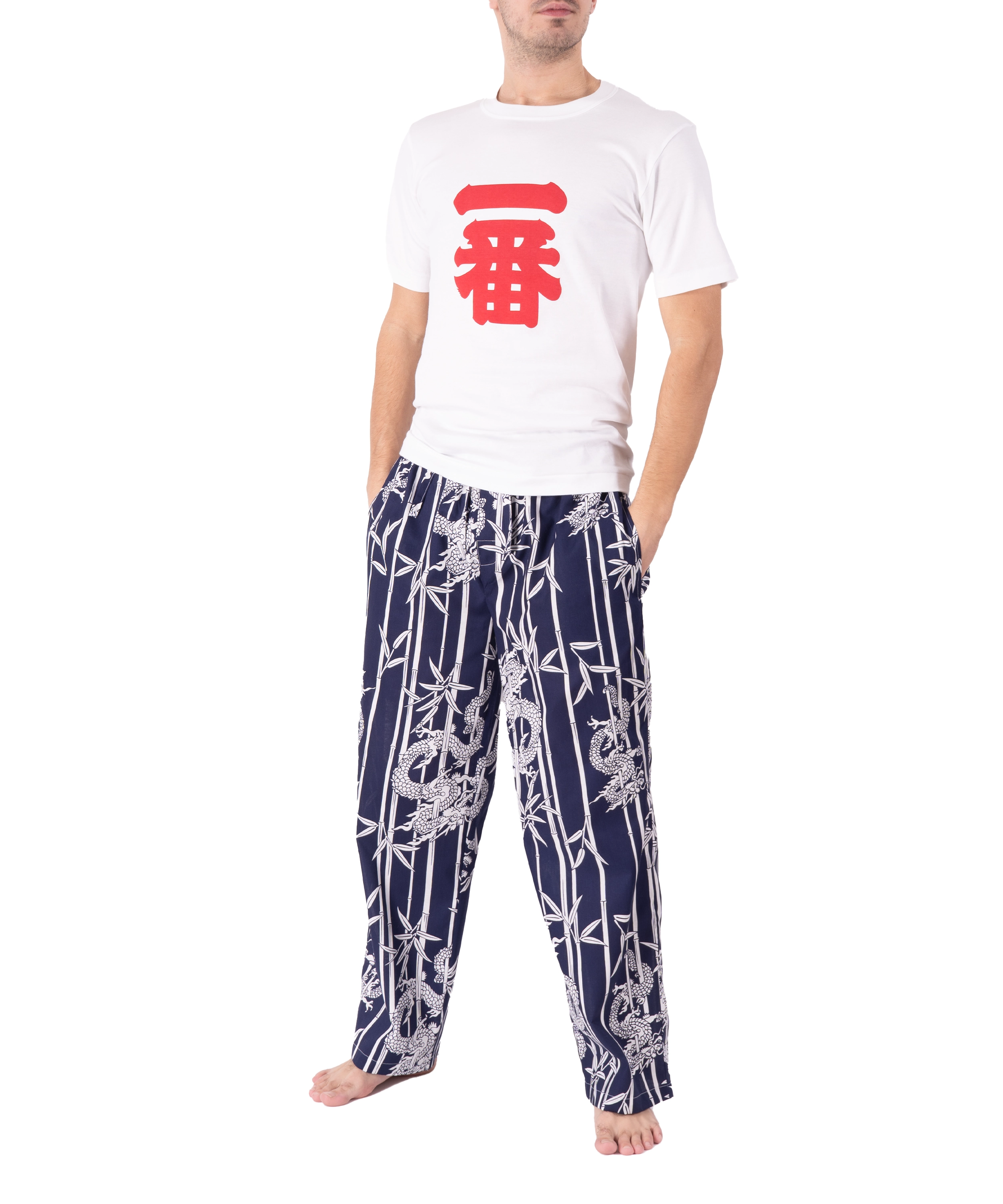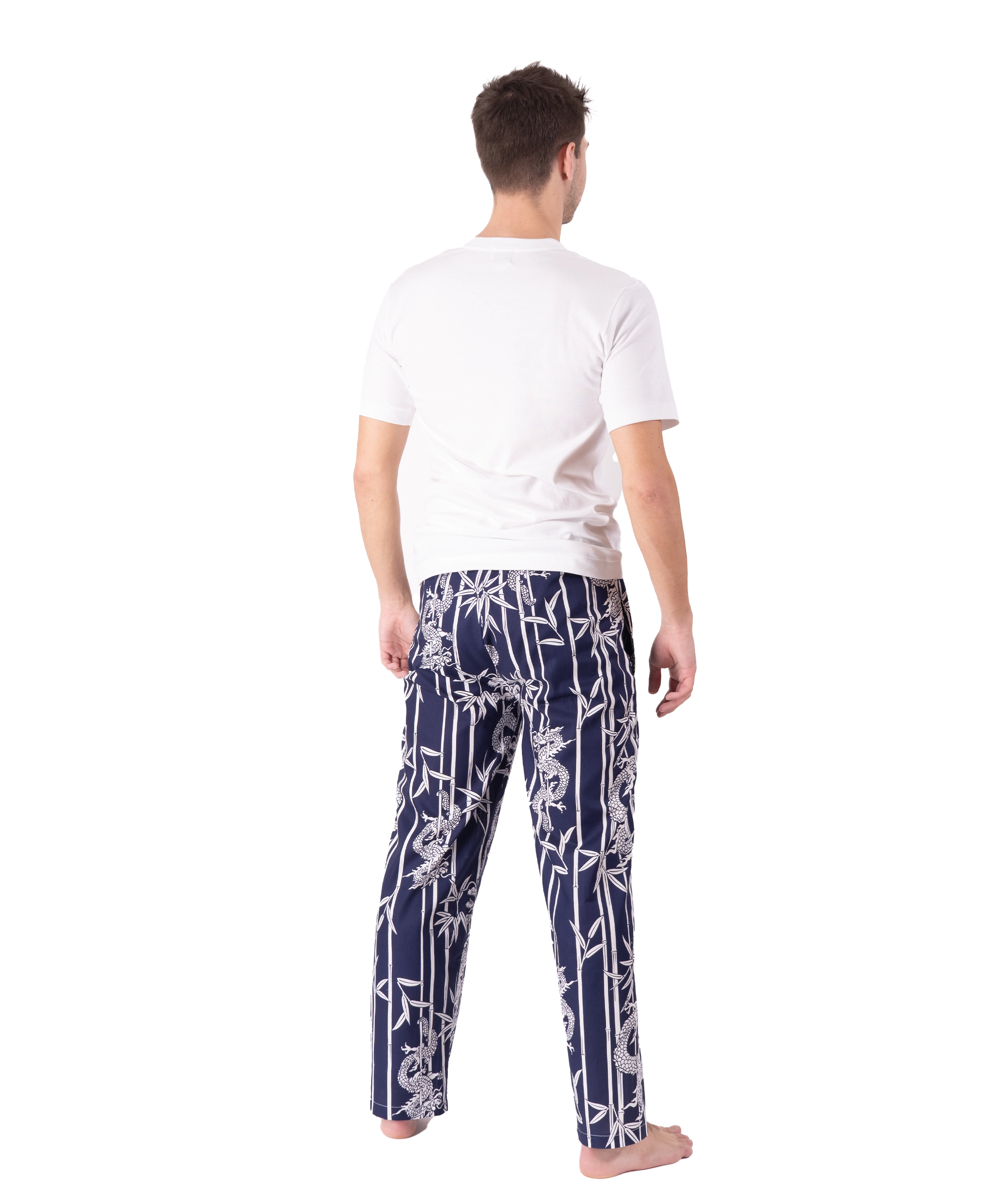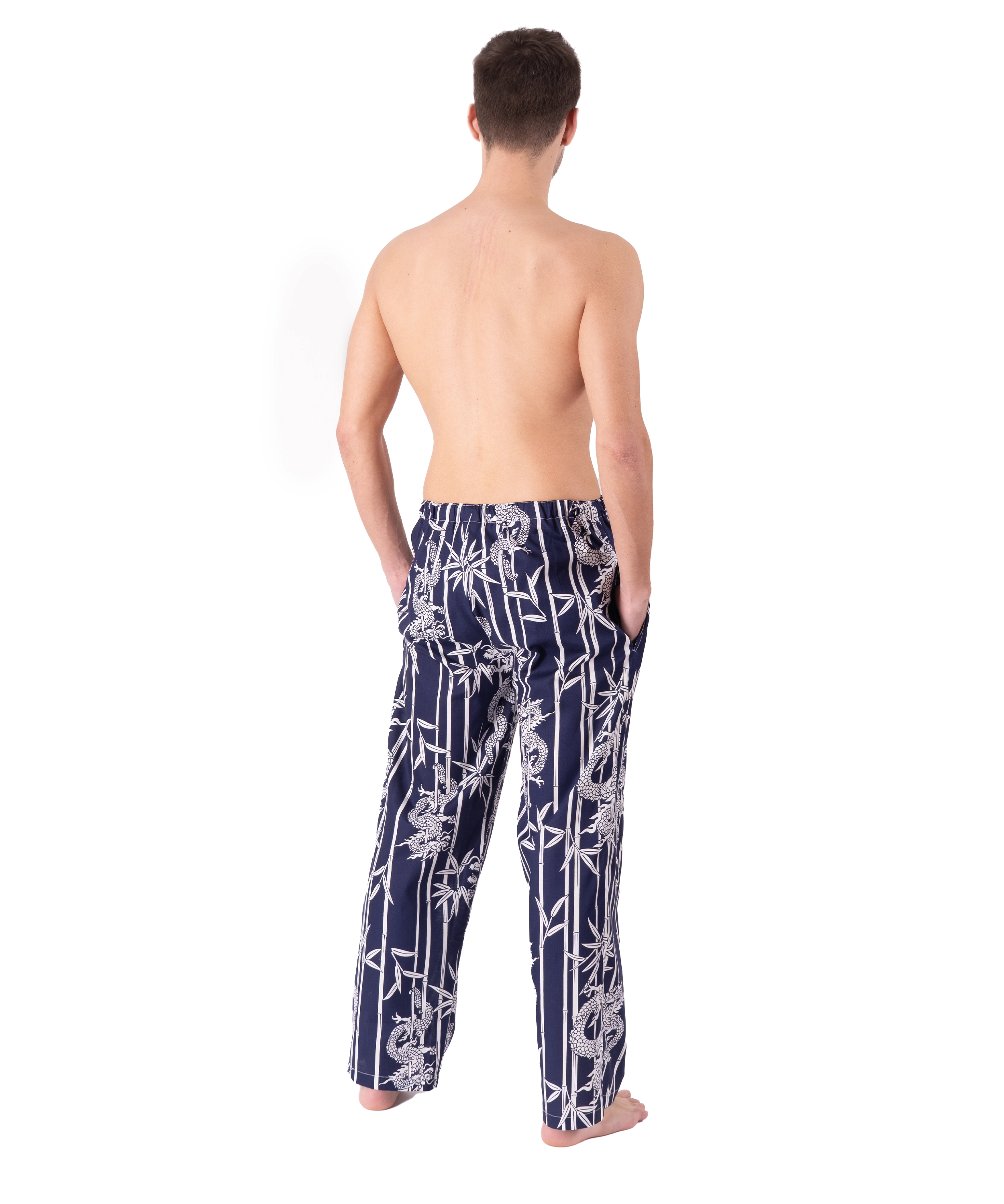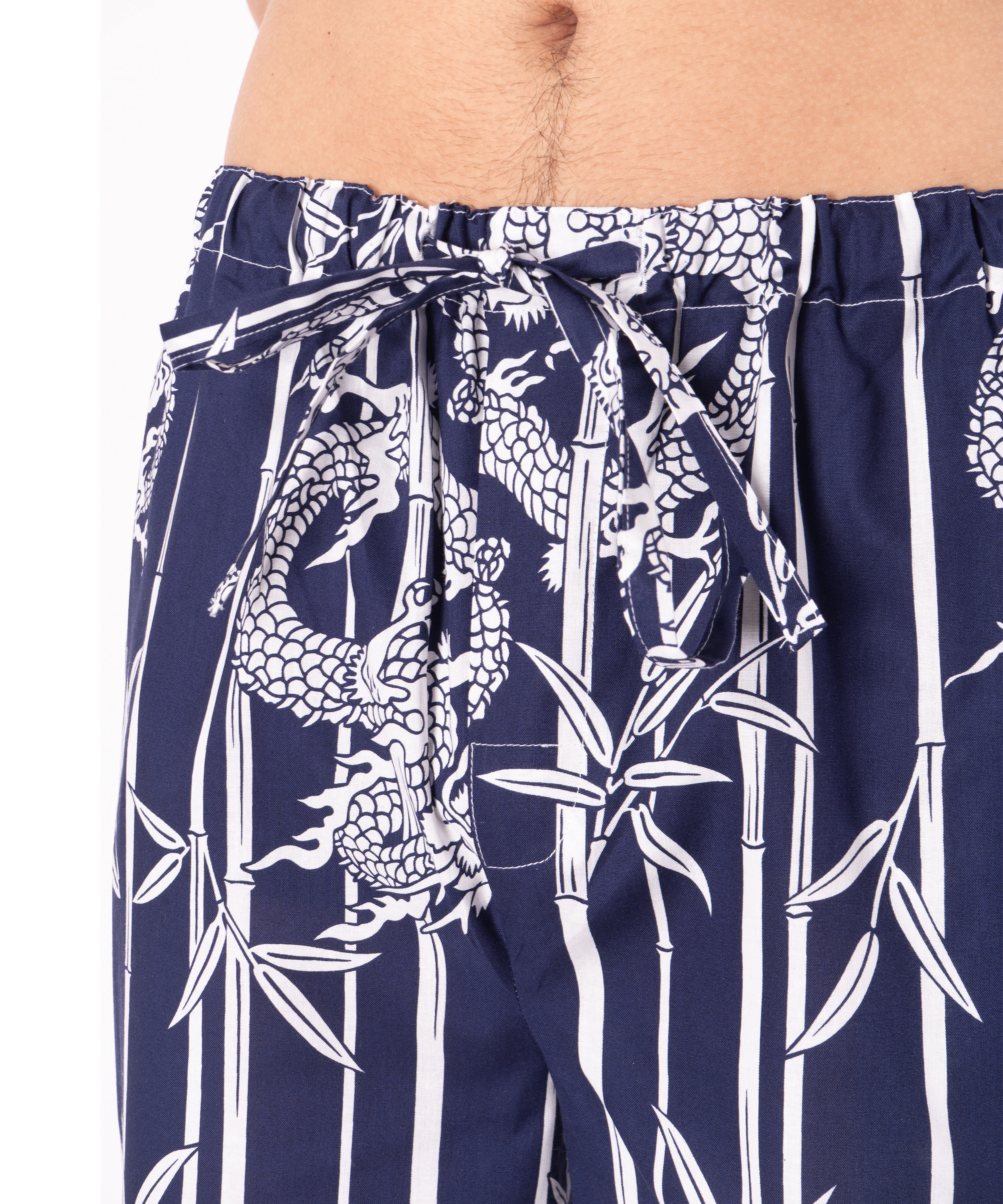 The top quality kimono cotton is printed with a Japanese navy bamboo and dragon design.ย The lounge pants feature two side pockets, elasticated waistband with self fabric tie and a false fly.ย The secret sauce is the one-size cut.ย Using their kimono experience our Japanese partners have crafted these lounge pants exclusively for Tom Dick and Harry.ย You won’t find them anywhere else in the World!