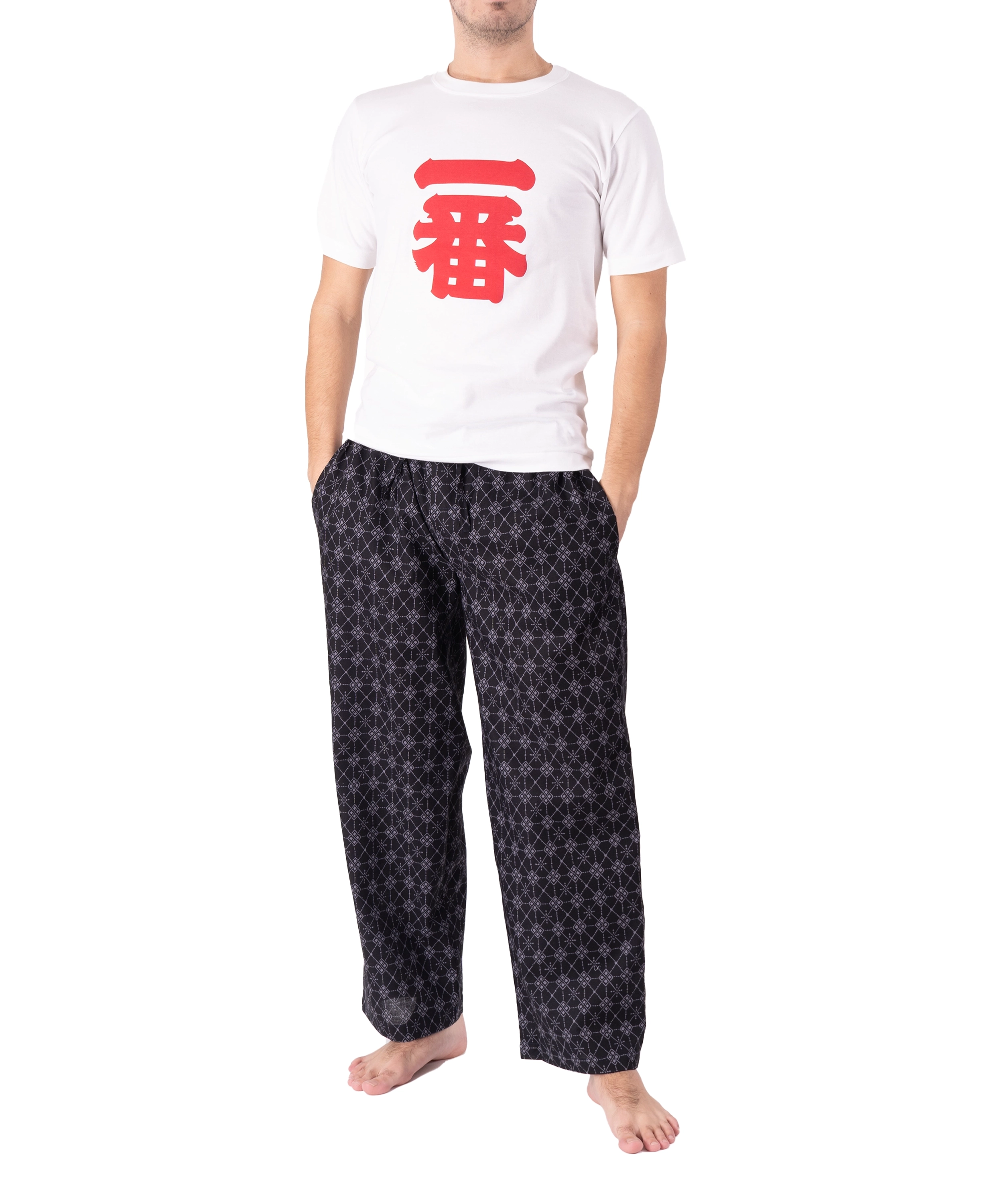 The top quality kimono cotton is printed with a geometric Arygle pattern in black and grey.ย The lounge pants feature two side pockets, elasticated waistband with self fabric tie and a false fly.ย The secret sauce is the one-size cut.ย Using their kimono experience our Japanese partners have crafted these lounge pants exclusively for Tom Dick and Harry.ย You won’t find them anywhere else in the World!