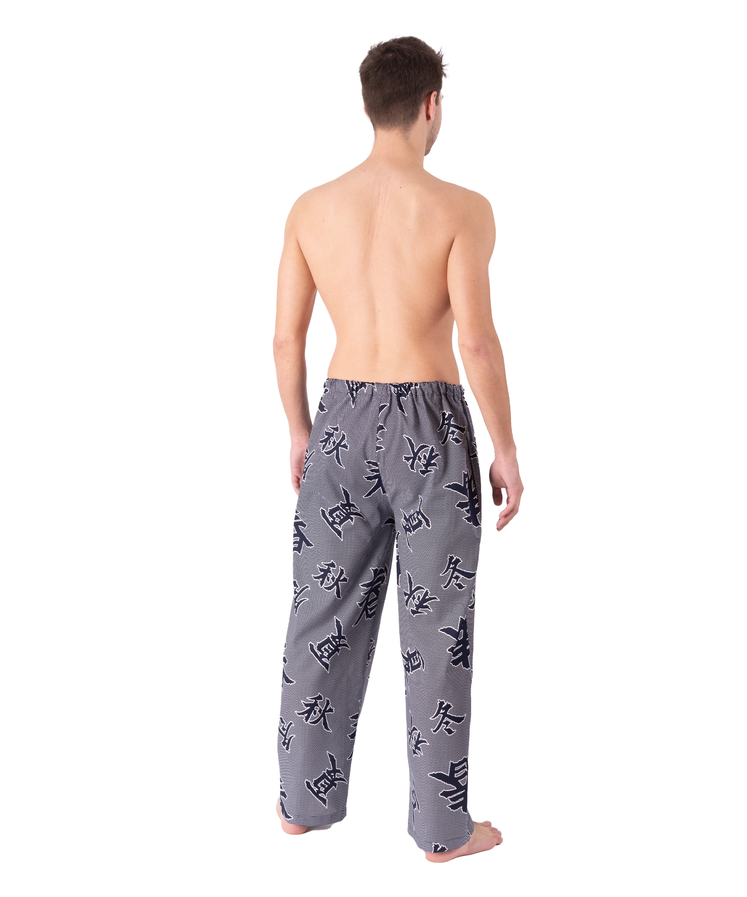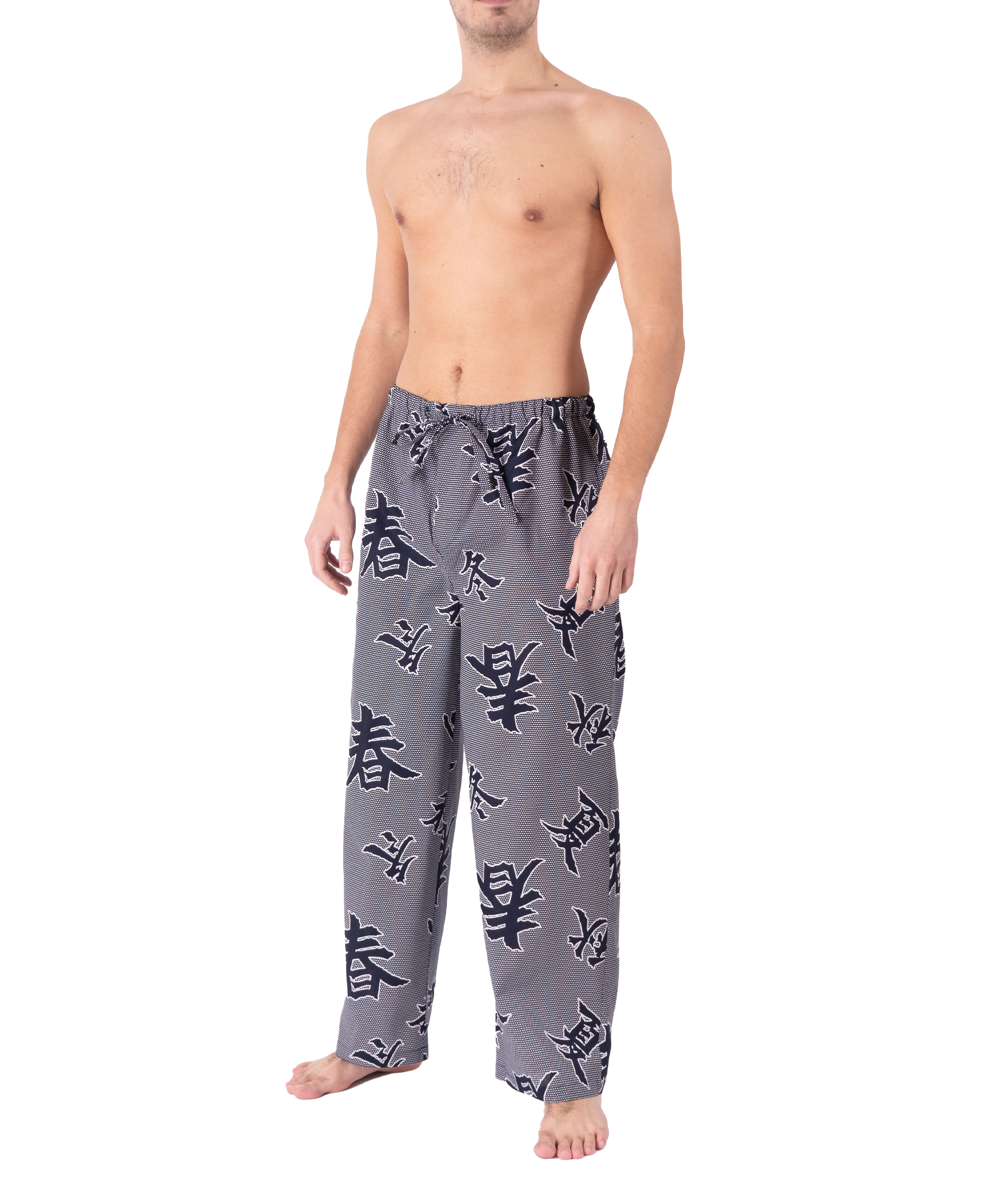 The top quality kimono cotton is printed with a Japanese four seasons Kanji design in navy and white.ย The lounge pants feature two side pockets, elasticated waistband with self fabric tie and a false fly.ย The secret sauce is the one-size cut.ย Using their kimono experience our Japanese partners have crafted these lounge pants exclusively for Tom Dick and Harry.ย You won’t find them anywhere else in the World!
