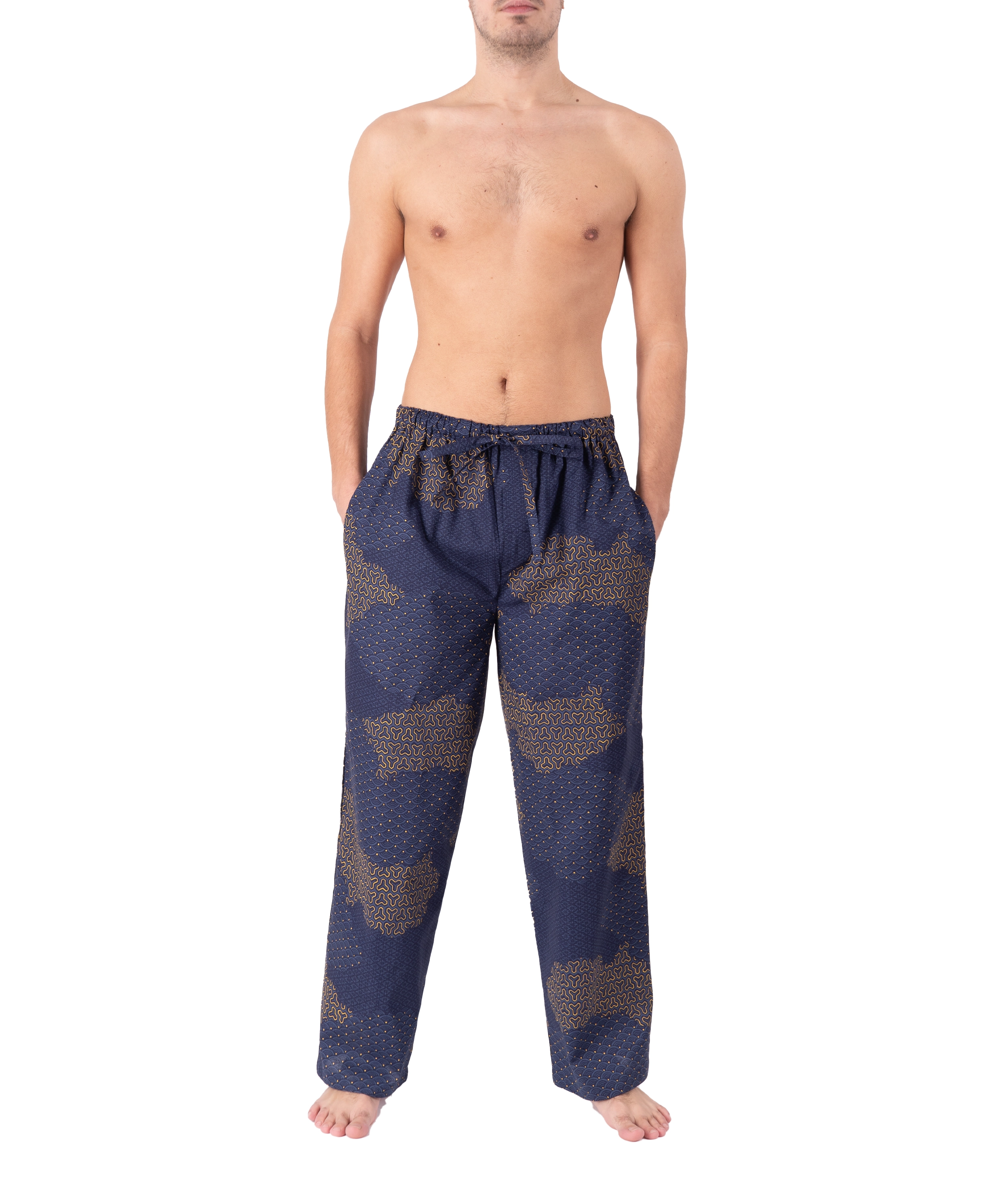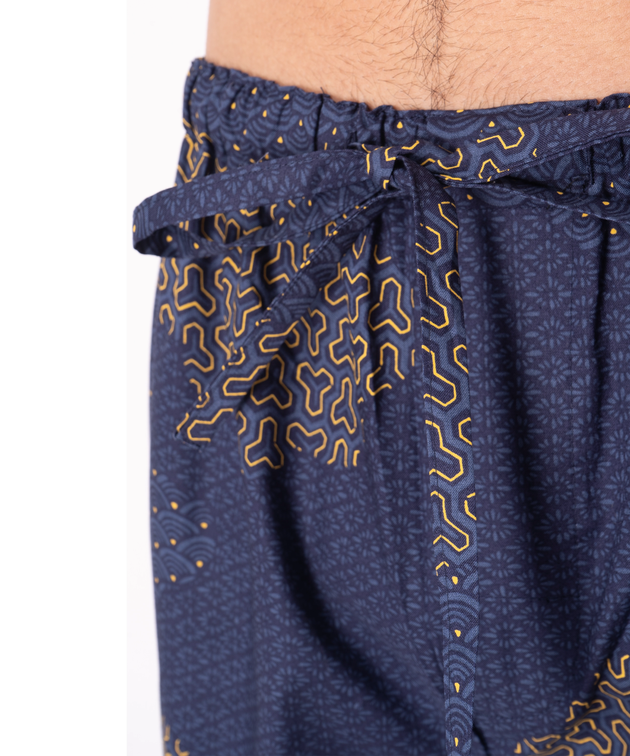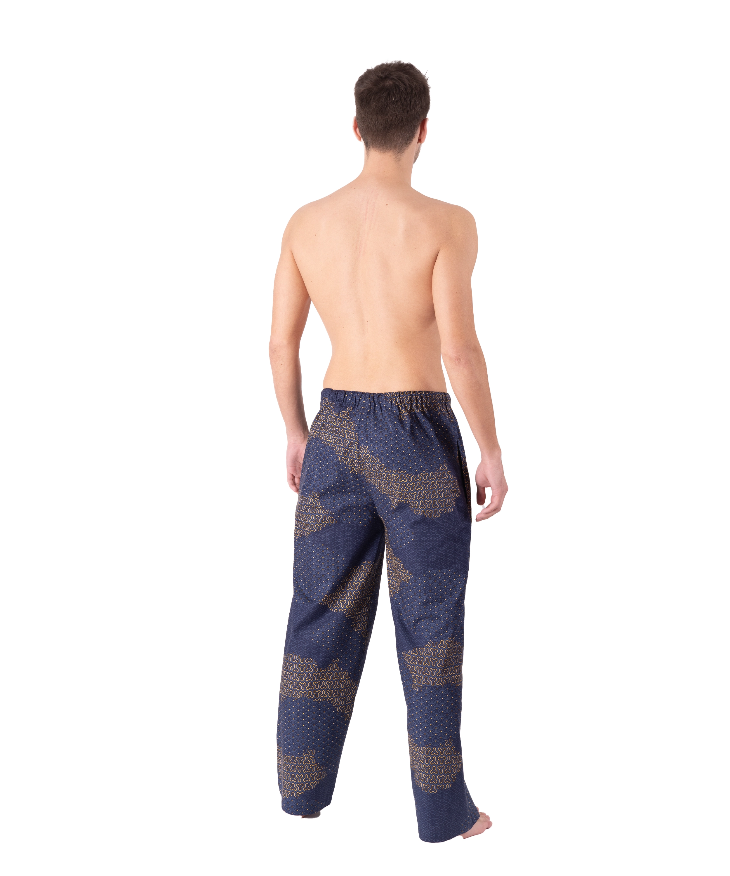 The top quality kimono cotton is printed with a abstract Japanese navy cloud design.ย The lounge pants feature two side pockets, elasticated waistband with self fabric tie and a false fly.ย The secret sauce is the one-size cut.ย Using their kimono experience our Japanese partners have crafted these lounge pants exclusively for Tom Dick and Harry.ย You won’t find them anywhere else in the World!
